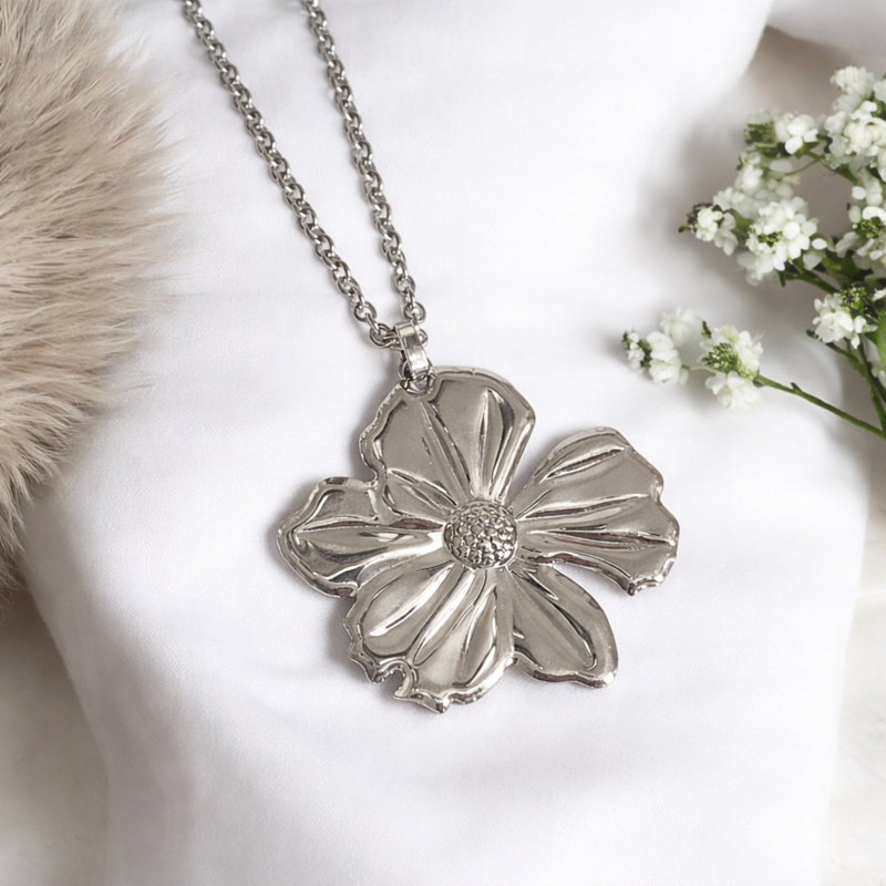 Ketting "Large Silver Flower" Kies zelf de lengte / Keuze uit echt leren ketting of stainless steel kettingDeze prachtige ketting heeft een grote bloemhanger die gemaakt is van stainless steel.