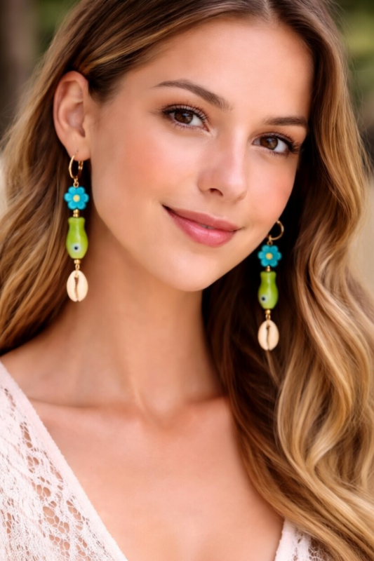 Groene Visjes Oorbellen "Ocean Whisper"Een speels groen visje, een turupise bloem en een delicate schelp – deze oorbellen brengen de serene sfeer van een tropisch strand direct naar je oren.