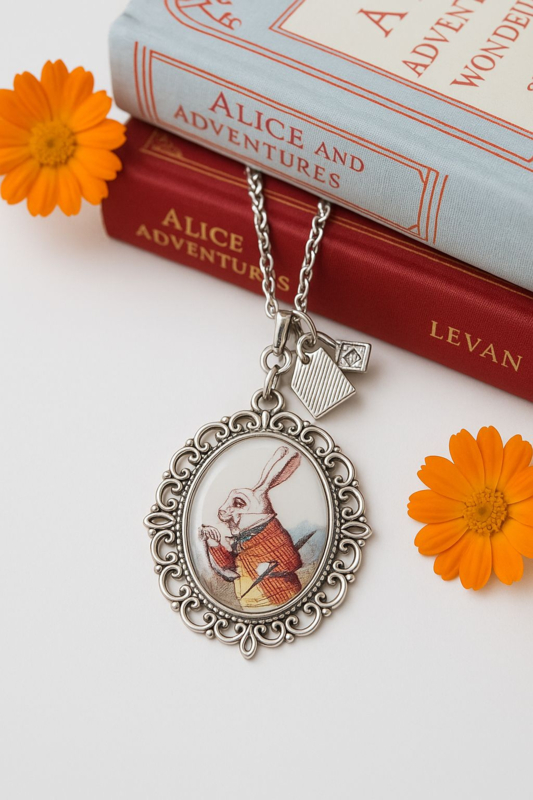 Prachtige vintage look ketting met hanger. De hanger bevat een afbeelding uit Alice in Wonderland.