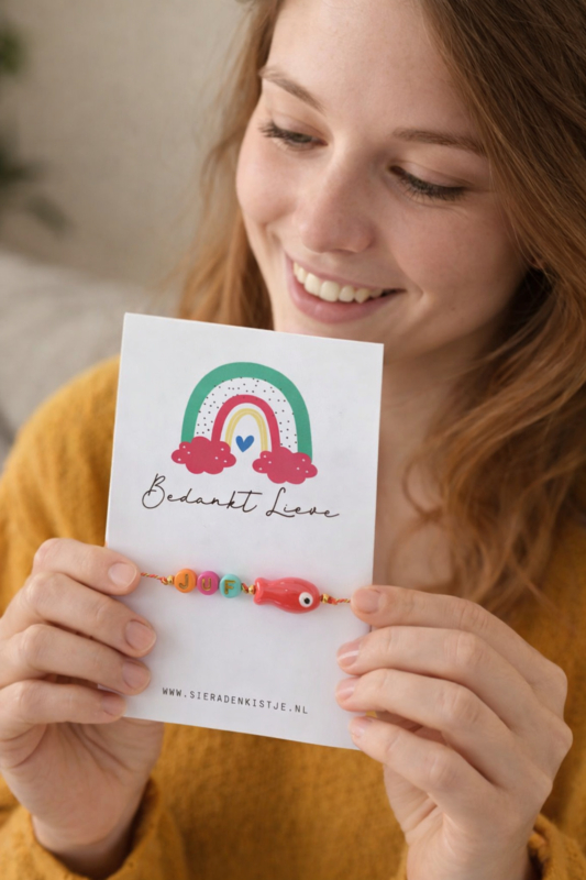 Dit handgemaakte armbandje bestaat uit speelse letterkralen met “JUF”, een schattig rood visje van keramiek en een oranje-rood gevlochten koord. Het armbandje wordt geleverd op een kaartje naar keuze – klaar om te geven!
